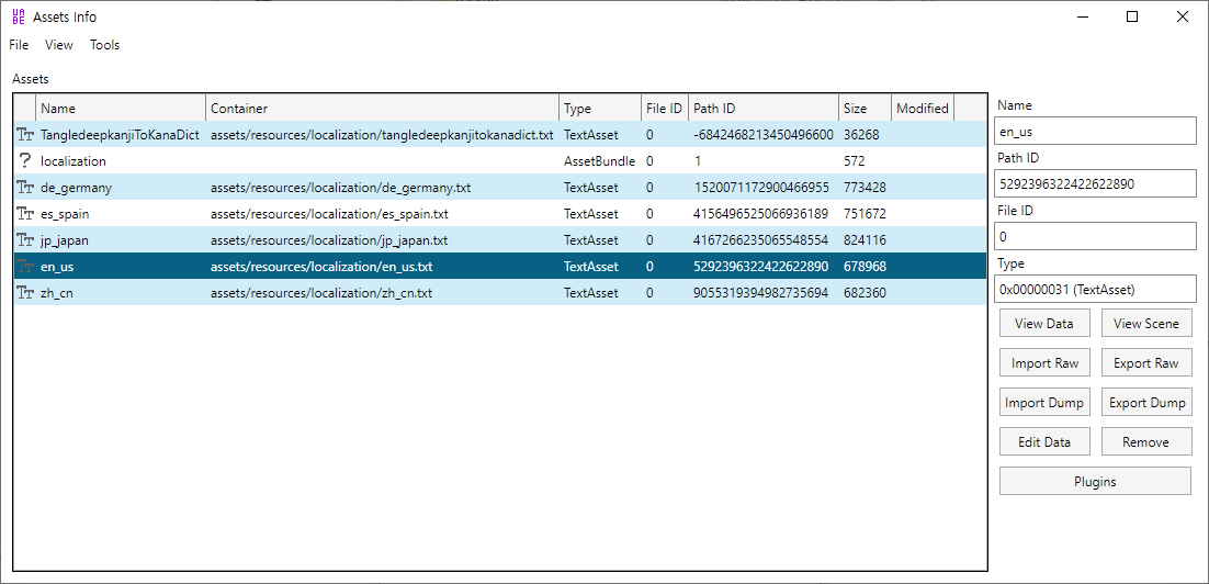 1. UABEA 프로그램으로 localization, localization_dlc1, localization_dlc2 파일을 연다.