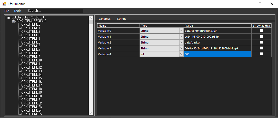 1. CfgBinEditor로 cpk_list.cfg.bin 파일을 연다.