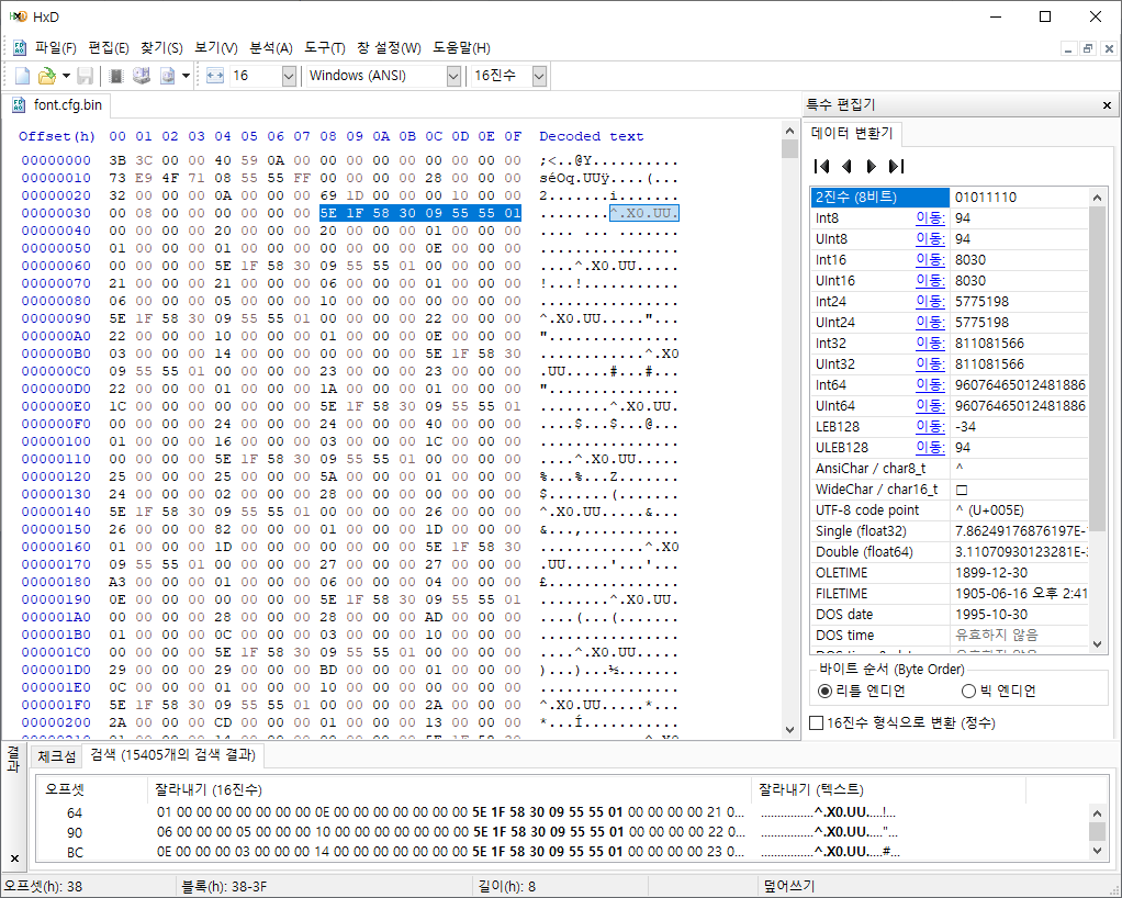 4. Font 정보 데이터는 식별자(5E 1F 58 30 09 55 55 01)를 시작으로 style, char id, x, y, width, height, channel 등으로 구성되어 있고,