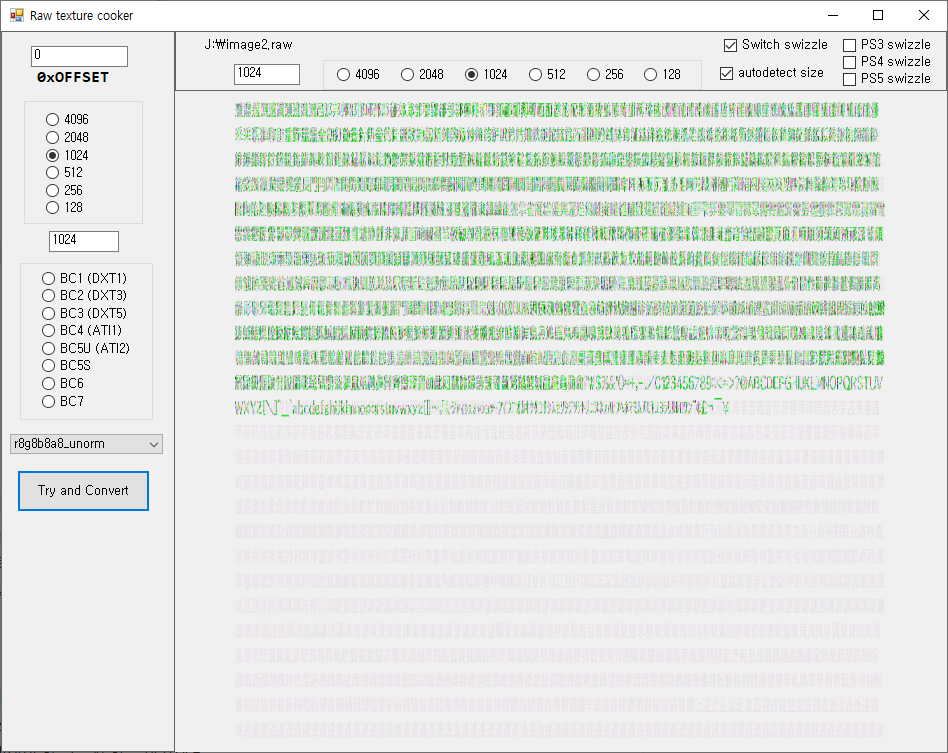 4. rawtex로 해상도나 설정들을 바꿔가며 테스트 해본 결과 의미있는 이미지를 추출하는데 성공함 (1024 x 1024, r8g8b8a8, switch swizzling 해제)