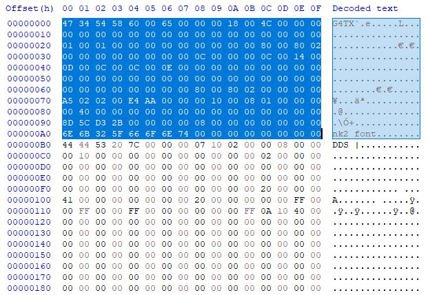 4. 이렇게 수정된 DDS 파일을 hex editor로 열어서 앞서 잘라낸 g4tx header를 맨 앞에 넣고, 파일명을 g4tx로 만들면 끝.